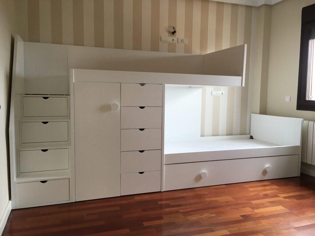Las literas no tienen porqué ser aburridas. En Muebles Limón atendemos las peticiones más especiales, como la de poner un tobogán en la cama más alta o crear una estructura de camas con forma de casita.